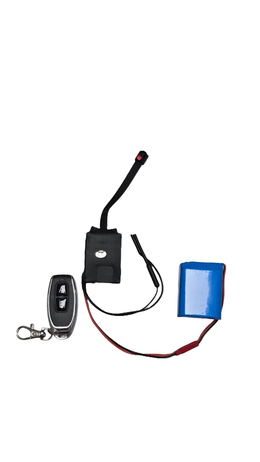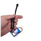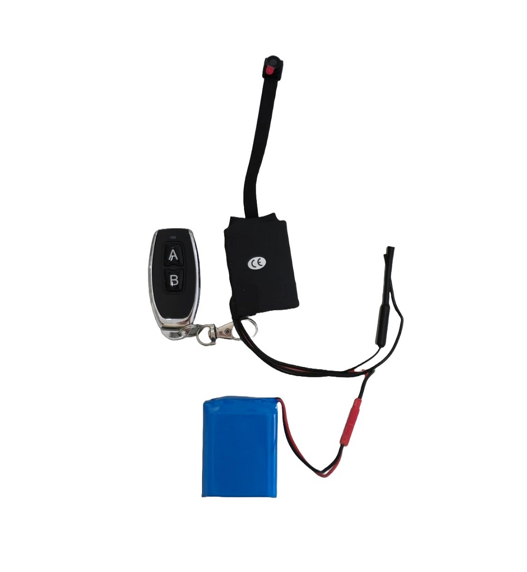 Īpaši mazs objekts pin hole objektīvs (1 cm) kameras modulis ar 5 cm elastīgu kabeli (moduļa izmēri: 5 cm x 3,5 cm x 1 cm) un 5000 mAh akumulators (5 cm x 4 cm x 2 cm).